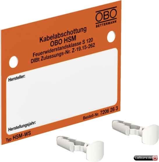 Zur vorschriftsmäßigen Kennzeichnung der Kabelbrandabschottung OBO HSM. Inhalt: 1 Wandschild, 2 Steckdübel