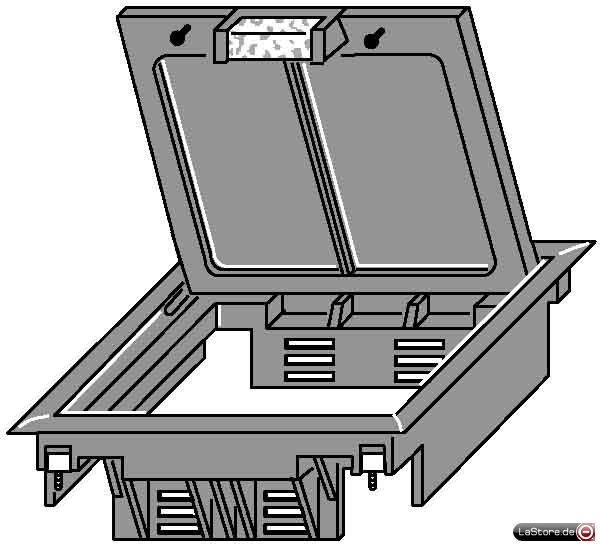 Geräteeinsatz für 4 Installationsgeräte in 2 Gerätebecher GB2 für den Einsatz in Kanalsystemen, mit Universalbefestigungswinkel, mit Teppichschutzrahmen, Klappdeckel und Schnurauslass aus Polyamid