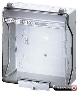 Aus Thermoplast, grau nach RAL 7035, zum Einbau von Geräten über Tragschienen oder Montageplatten (zusätzlich bestellen), Scharnierdeckel transparent, Verschluss für Werkzeugbetätigung, plombierbar. Mit Einsteckstutzen 2x ESt 16 für D= 9-16 mm und 1x ESt 21 für D=9-21 mm.
