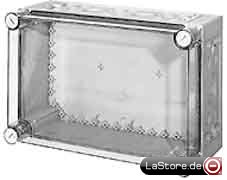Ohne Montageplatte, PG-Vorprägungen für die Leitungseinführung in allen Seitenwänden, durch Ausbrechen dieser Wände (Spiegel) lassen sich großflächige Durchbrüche herstellen, einschließlich Befestigungslaschen für Wandbefestigung, Verbindung der Gehäuse unter- bzw. nebeneinander mittels Keilverbindung.