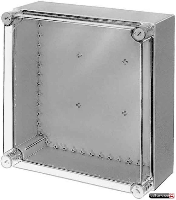 Ohne Montageplatte, PG-Vorprägungen für die Leitungseinführung in allen Seitenwänden, durch Ausbrechen dieser Wände (Spiegel) lassen sich großflächige Durchbrüche herstellen, einschließlich Befestigungslaschen für Wandbefestigung, Verbindung der Gehäuse unter- bzw. nebeneinander mittels Keilverbindung