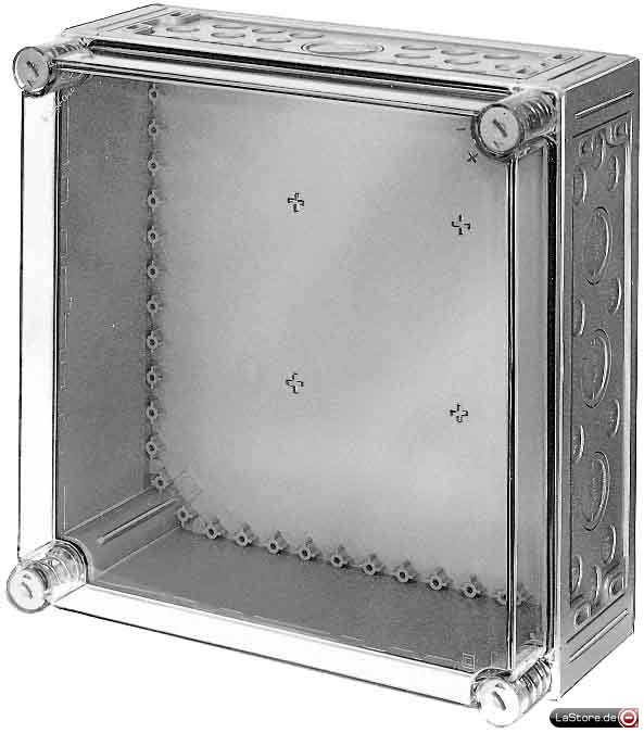 Ohne Montageplatte, PG-Vorprägungen für die Leitungseinführung in allen Seitenwänden, durch Ausbrechen dieser Wände (Spiegel) lassen sich großflächige Durchbrüche herstellen, einschließlich Befestigungslaschen für Wandbefestigung, Verbindung der Gehäuse unter- bzw. nebeneinander mittels Keilverbindung