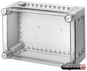 Ohne Montageplatte, oben und unten großflächige Durchbrüche sowie Öffnungen zur Aufnahme der Keilverbindung, geschlossene Seitenwände, in denen sich durch Ausbrechen großflächige Durchbrüche herstellen lassen, Montage der Gehäuse im Verteilerverband mittels Keilerverbindung, oben und unten verschließbar durch Flansche FL2, FL4