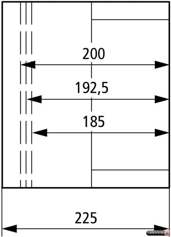 Ohne Montageplatte, PG-Vorprägungen für die Leitungseinführung in allen Seitenwänden, durch Ausbrechen dieser Wände (Spiegel) lassen sich großflächige Durchbrüche herstellen, einschließlich Befestigungslaschen für Wandbefestigung, Verbindung der Gehäuse unter- bzw. nebeneinander mittels Keilverbindung.