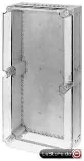 Ohne Montageplatte, oben und unten großflächige Durchbrüche sowie Öffnungen zur Aufnahme der Keilverbindung, geschlossene Seitenwände, in denen sich durch Ausbrechen großflächige Durchbrüche herstellen lassen, Montage der Gehäuse im Verteilerverband mittels Keilerverbindung, oben und unten verschließbar durch Flansche FL2, FL4