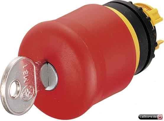 Farbe des Knopfes: rot Frontform: rund Durchmesser der Kappe: 36,5 mm Lochdurchmesser: 22,3 mm Schutzart (IP): IP67 Bauform des Knopfes: hoch Form der Entriegelung: Schlüssel-Entriegelung