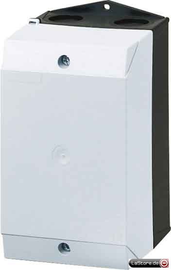 Gehäuseunterteil schwarz RAL 9005, Gehäuseoberteil hellgrau RAL 7035. Metrische Vorprägungen oben und unten, in der Rückwand