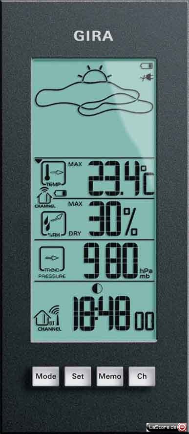 Das Set besteht aus einer Funk-Wetterstation für den Innenraum und einem Funk-Sensor für die Außen- oder Innenmontage. Funk-Wetterstation: - Designvielfalt durch Integration in System 55/E22 - Montage sowohl mit als auch ohne Abdeckrahmen möglich - Spannungsversorgung über 2 Knopfzellen CR 2032 oder optionalen Netzadapter 0341 00 - Bis zu 4 Funk-Sensoren einlernbar - Wettervorhersage mit animierten Symbolen - Batterie-Zustandsanzeige für Funk-Wetterstation und Funk-Sensor - Anzeige der Innen- und Außentemperatur mit Trendanzeige - Anzeige der Innen- und Außenluftfeuchte mit Trendanzeige - Barometer mit Trendanzeige - Mondphasen-Anzeige - Uhrzeit- und Datumsanzeige Hinweis: Bei der Montage auf einer 58er Unterputzdose ist ein Abdeckrahmen 2-fach ohne Mittelsteg erforderlich. Funk-Sensor: - Spritzwassergeschütztes Gehäuse - Zweizeilige LCD-Display mit Uhrzeit-, Temperatur- oder Luftfeuchte-Anzeige - Funkuhr - Batteriewechsel- und Kanalanzeige - Tischaufsteller oder Wandaufhängung 08 80 650: Komplett mit Abdeckrahmen E2 reinweiß glänzend