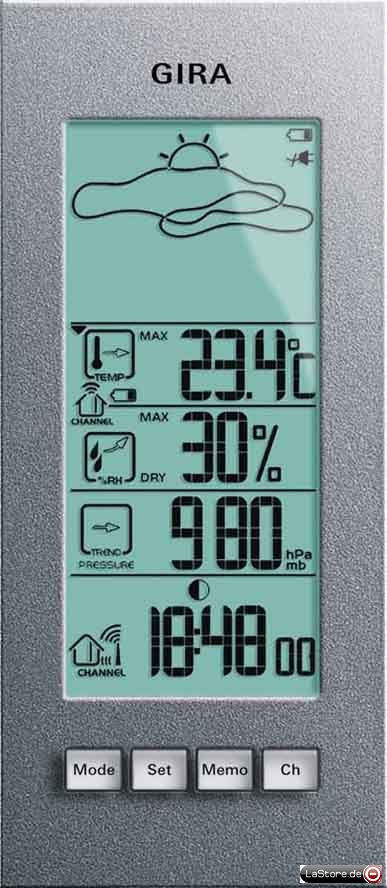Das Set besteht aus einer Funk-Wetterstation für den Innenraum und einem Funk-Sensor für die Außen- oder Innenmontage. Funk-Wetterstation: - Designvielfalt durch Integration in System 55/E22 - Montage sowohl mit als auch ohne Abdeckrahmen möglich - Spannungsversorgung über 2 Knopfzellen CR 2032 oder optionalen Netzadapter 0341 00 - Bis zu 4 Funk-Sensoren einlernbar - Wettervorhersage mit animierten Symbolen - Batterie-Zustandsanzeige für Funk-Wetterstation und Funk-Sensor - Anzeige der Innen- und Außentemperatur mit Trendanzeige - Anzeige der Innen- und Außenluftfeuchte mit Trendanzeige - Barometer mit Trendanzeige - Mondphasen-Anzeige - Uhrzeit- und Datumsanzeige Hinweis: Bei der Montage auf einer 58er Unterputzdose ist ein Abdeckrahmen 2-fach ohne Mittelsteg erforderlich. Funk-Sensor: - Spritzwassergeschütztes Gehäuse - Zweizeilige LCD-Display mit Uhrzeit-, Temperatur- oder Luftfeuchte-Anzeige - Funkuhr - Batteriewechsel- und Kanalanzeige - Tischaufsteller oder Wandaufhängung 08 80 650: Komplett mit Abdeckrahmen E2 reinweiß glänzend