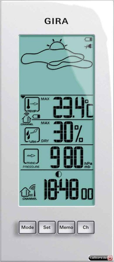Das Set besteht aus einer Funk-Wetterstation für den Innenraum und einem Funk-Sensor für die Außen- oder Innenmontage. Funk-Wetterstation: - Designvielfalt durch Integration in System 55/E22 - Montage sowohl mit als auch ohne Abdeckrahmen möglich - Spannungsversorgung über 2 Knopfzellen CR 2032 oder optionalen Netzadapter 0341 00 - Bis zu 4 Funk-Sensoren einlernbar - Wettervorhersage mit animierten Symbolen - Batterie-Zustandsanzeige für Funk-Wetterstation und Funk-Sensor - Anzeige der Innen- und Außentemperatur mit Trendanzeige - Anzeige der Innen- und Außenluftfeuchte mit Trendanzeige - Barometer mit Trendanzeige - Mondphasen-Anzeige - Uhrzeit- und Datumsanzeige Hinweis: Bei der Montage auf einer 58er Unterputzdose ist ein Abdeckrahmen 2-fach ohne Mittelsteg erforderlich. Funk-Sensor: - Spritzwassergeschütztes Gehäuse - Zweizeilige LCD-Display mit Uhrzeit-, Temperatur- oder Luftfeuchte-Anzeige - Funkuhr - Batteriewechsel- und Kanalanzeige - Tischaufsteller oder Wandaufhängung 08 80 650: Komplett mit Abdeckrahmen E2 reinweiß glänzend