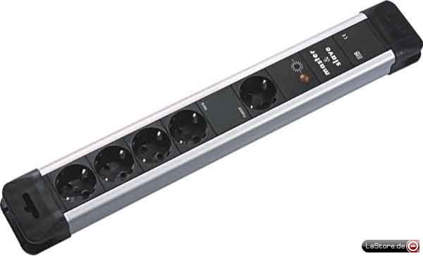 Mit Schwellenwerteinstellung, Schaltung der 4 Slave-Dosen durch Einschalten des Gerätes in der Master-Dose, Kunststoffprofil silber, schwarze Endkappen, mit Kinderschutz, mit 2-poligem Wippschalter beleuchtet und Zuleitung: 2 m H05VV-F3G1,50 mm², schwarz