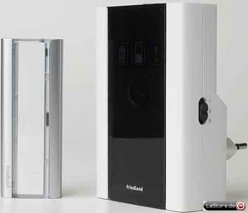 Gong-Set, Farbe: Schwarz/Weiss, 868 MHz-Funk-Frequenz, optische und akustische Signalgeberanzeige, Lautstärkenregler, Reichweite von 150 m, bis zu 3 verschiedene Taster am Empfänger einlernbar, CD-Klangqualität, keine Batterien notwendig (Stromversorgung via Steckdosen)