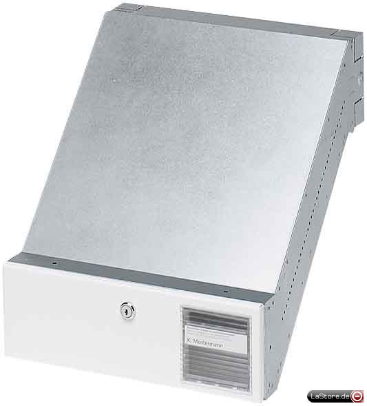 Nach DIN 32617, in schräger 45°-Ausführung, ausziehbar von 290-440 mm, neben- und übereinander anreihbar. Rückseitige Entnahmetür, nach unten aufgehend, mit Zylinderschloss, Namensschild, Informationsfenster und Verbindungsschrauben. Einsetzbar nur in Verbindung mit BE 611-3/... .