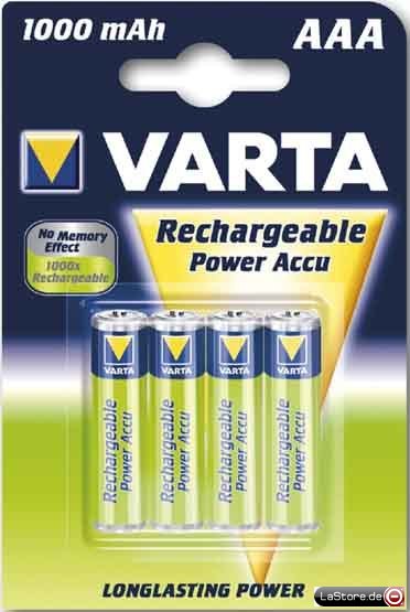 Größenbezeichnung: MicroNennspannung: 1,2 VKapazität: 1000 mAhAusführung: Nickel-HydridVerpackung: 4er Blister