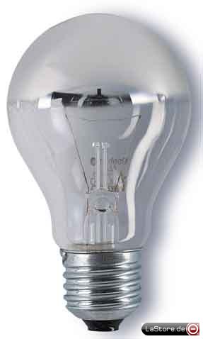 Silber- oder goldkuppenverspiegelte Glühlampe. Die Kuppenverspiegelung verhindert direktes Licht und bietet dadurch hervorragenden Blendschutz.