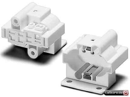 Für einseitig gesockelte Kompakt-Leuchtstofflampen TC-SEL, Durchgangslöcher für Schrauben M4, seitliche und rückseitige Bohrungen für selbstschneidende Schrauben nach ISO 1481/7049-ST4,2-C/F, vorderseitige Durchgangslöcher für Schrauben M3