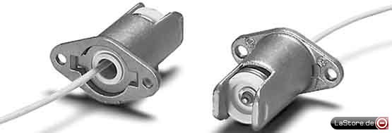 Beim Einbau müssen Schutz gegen elektrischen Schlag sowie Kriech- und Luftstrecken zu aktiven Teilen an der Rückseite der Fassung sichergestellt werden, bei der Benutzung des Zentralloches des Bügels zur Befestigung in der Leuchte muss durch Abstützung sichergestellt sein, dass keine Verformung des Bügels auftreten kann, Durchgangslöcher für Schrauben M3, Leitungslänge 350 mm, Befestigungsflansch