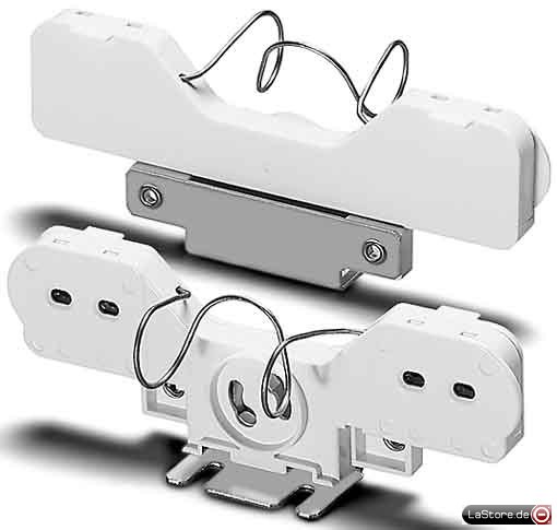 Lichtpunkthöhe 36,3 mm, Befestigungsschlitze für Schrauben M4, doppelseitige Kontakte, Drahtbügel zum Halten der Lampe