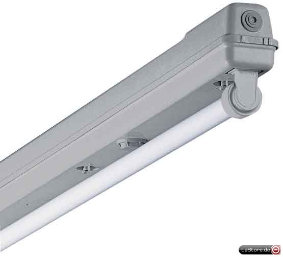 Leuchtenkörper Polyesterharz, schwer entflammbar, glasfaserverstärkt, hellgrau. Mit stirnseitiger und mittiger Einspeisungsmöglichkeit. Anschlussfertig verdrahtet mit 3-poliger Anschlussmöglichkeit für Netzanschluss und -weiterleitung bis 2,5 mm², zuzüglich Schutzleiterklemme