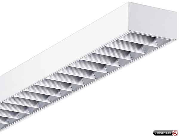Leuchtenkörper Stahlblech, weiß pulverbeschichtet, mit stirnseitigen Ausbrechöffnungen für wärmebeständige Durchgangsverdrahtung, Spiegelraster RSV aus Reinstaluminium eloxiert, mit stufenweise konkav profilierten Querlamellen, tief-breit strahlend