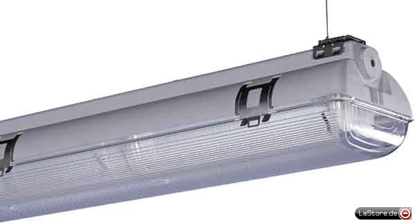 Monsun Feuchtraum-Wannenleuchte mit Prismenwanne aus PMMA, VVG 1 x T26, 36 W, induktiv, Gehäuse aus Polyester, glasfaserverstärkt, grau, Schutzart:IP65, SK I (Schutzerdung), Abgabe nur in Paletteneinheiten, Deckenbefestigung beigelegt, ohne Kettenabhänger, Wannenverschlüsse beigelegt