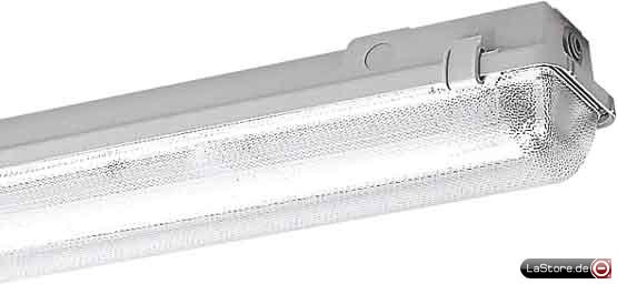 Gehäuse glasfaserverstärktes Polyester, geschäumte Polyurethandichtung, Abdeckung aus klarem, perlstrukturiertem Acrylglas (PMMA) mit Schlagzähkomponente, einteilige Kunststoffklammern, Stahlblechreflektor weiß, aushängbar, mit aufmontierten elektrischen Komponenten, Drehverschlüsse zur Schnellmontage, variable Kabeleinführung, 2 Verschlussstopfen M20