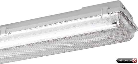Gehäuse glasfaserverstärktes Polyester, geschäumte Polyurethandichtung, Abdeckung aus klarem, perlstrukturiertem Acrylglas (PMMA) mit Schlagzähkomponente, einteilige Kunststoffklammern, Stahlblechreflektor weiß, aushängbar, mit aufmontierten elektrischen Komponenten, Drehverschlüsse zur Schnellmontage, variable Kabeleinführung, 2 Verschlussstopfen M20, geeignet für Räume mit erhöhter Brandgefahr