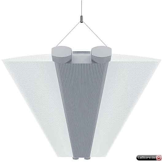 Mit SLC-Waveguide-Lichttechnik, indirekt-direkt strahlend, Direktlichtanteil über eingekoppeltes Licht im SLC-Waveguide, reduzierte Leuchtdichte bei 65°, extrem flache Bauform des Lichtkörpers, komplett mit Seilabhängung, 1000 mm (Y-Aufhängung).
