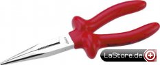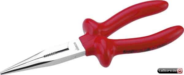 Nach DIN ISO 5745, mit eingelegtem Gelenk, lange, flach-runde Backen (Flachrundzange), gezahnte Greifflächen, mit Schneiden für mittelharten und weichen Draht, Griffe mit zweifarbiger, doppelwandiger Kunststoff-Tauchisolation, 1000 Volt Schutzisolation nach VDE, DIN EN 60900