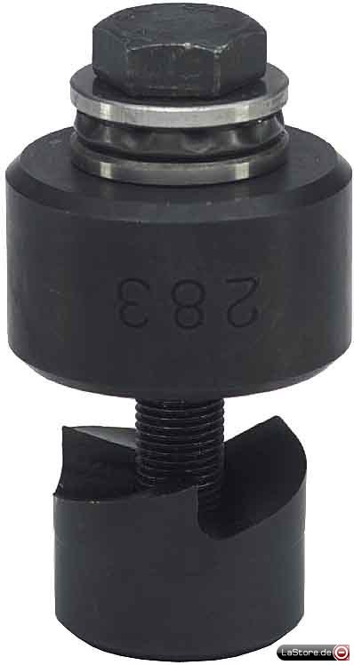 Rundlocher mit Kugellagerung für kraftschonende Betätigung, auch mit Hydraulikstanze zu bedienen (dann jedoch OHNE Kugellager einsetzen), der Stanzabfall wird in 3 Teile gespalten, dadurch können Stanzabfälle nicht am Stempel und in der Matrize festklemmen, sondern lassen sich durch Kippen der Matrize leicht entfernen, dadurch höhere Stanzleistung