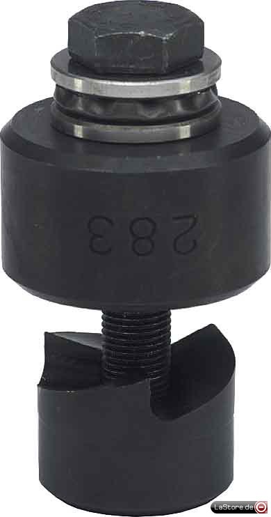 Rundlocher mit Kugellagerung für kraftschonende Betätigung, auch mit Hydraulikstanze zu bedienen (dann jedoch OHNE Kugellager einsetzen), der Stanzabfall wird in 3 Teile gespalten, dadurch können Stanzabfälle nicht am Stempel und in der Matrize festklemmen, sondern lassen sich durch Kippen der Matrize leicht entfernen, dadurch höhere Stanzleistung