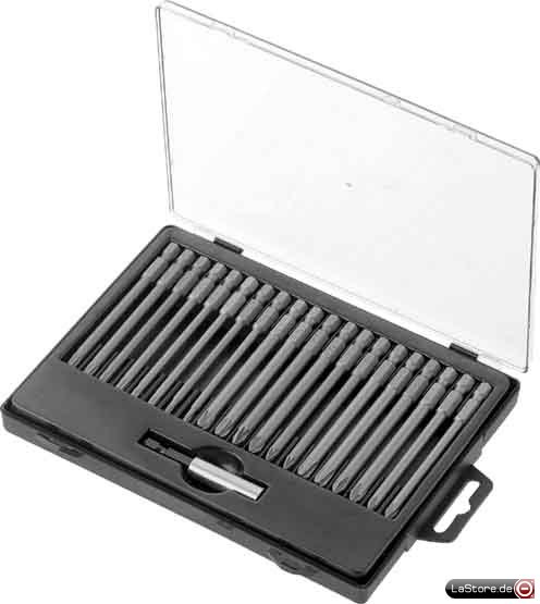 Set, bestehend aus 1 Universal-Bithalter mit Dauermagnet, Länge 60 mm, je zwei Stück Bits Kreuzschlitz Philips PH 1, PH 2, PH 3, Kreuzschlitz Pozidriv PZ 1, PZ 2, PZ 3, TORX® Größe T 10 - T 15 - T 20 - T 25, Bitlängen 90 mm