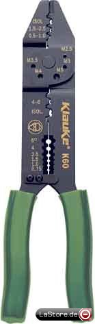 Für 2,8 / 4,8 / 6,3 mm Steckbreite. Pressung von Litze und Kabelisolation erfolgt in zwei Arbeitsgängen. Mit Abschneider für Schrauben M2,6 bis M5 und Drahtschneider.