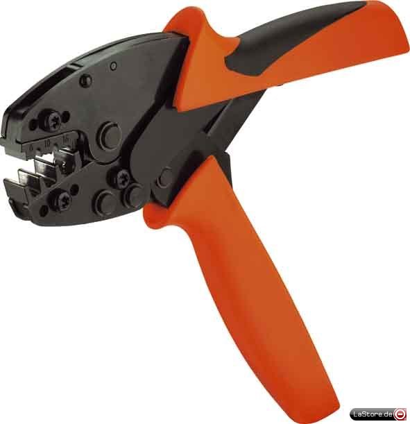 Aderendhülseneinführung seitlich, Zwangssperre garantiert Qualitätscrimp, Entriegelungsmöglichkeit bei eventueller Fehlbedienung, für Aderendhülsen mit und ohne Kunststoffkragen, drei Crimpstationen entsprechend der Leiterquerschnitte, Crimp entspricht Europa-Norm EN 60947-1, Zulassung nach VG 95211 (militärische Bezeichnung: VG 95236T 14A 002)