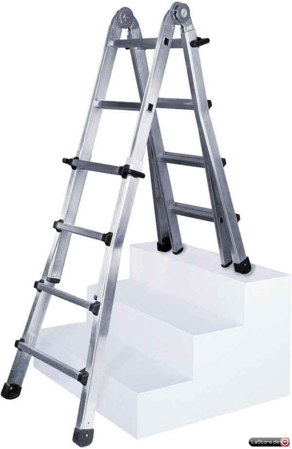 Läßt sich als höhenverstellbare Steh- uns Anlegeleiter verwenden. Durch Einsatz mit unterschiedlichen Schenkellängen auch auf geneigter Aufstellfkäche (Treppe) einsetzbar.