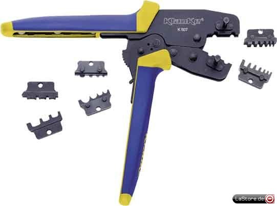 Zange mit Hebelübersetzung für Einhandbetrieb mit geringem Handkraftaufwand. Nachstellbare Ratschenmechanik mit Sperrvorrichtung für normgerechten Pressdruck; die Zange öffnet erst dann, wenn die korrekte Presskraft aufgebracht ist.