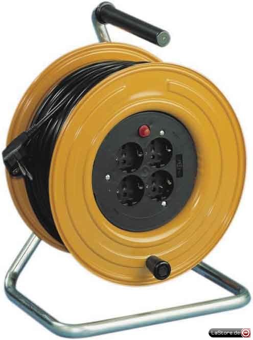 Großer, kabelschonender Wickelkern mit knickfreier Kabeleinführung und wirksamer Zugentlastung, mit Feststellbremse, Tragegriff aus verzinktem Stahlrohr, ohne Schweißnaht. 16 Amp., 250 V~
