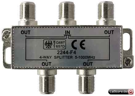 Vierfach Verteiler mit F-Anschlüssen zum Anschrauben mit hohem Wandabstand zur leichten F-Stecker Montage. Einsatzbereich 5 - 860 MHz, Rückkanaltauglich im Bereich 5 - 40 MHz. Die Durchgangsdämpfung liegt im VHF-Bereich bei 6,8 - 7,2 db, im UHF-Bereich bei 7,0 - 7,8 db.