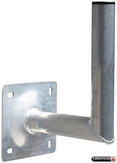Dieser leichte Aluminium-Wandhalter wird in Deutschland hergestellt und zwecks Korrosionsschutz nach der Fertigung poliert und eloxiert. Der Rohrdurchmesser beträgt 50mm, die Größe der Grundplatte ist 150 x 150mm. Der Wandhalter hat ein Wandabstandsmaß von 250mm und eine Masthöhe von 300mm. Er ist TÜV und Windlast geprüft. Zur Montage wird der KREILING DÜS Schrauben-Dübelset benötigt.