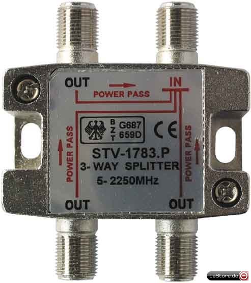 Dreifach Verteiler mit F-Anschlüssen zum Anschrauben mit hohem Wandabstand zur leichten F-Stecker Montage. Einsatzbereich 5 - 2250 MHz, Rückkanaltauglich im Bereich 5 - 60 MHz. Der Verteiler hat einen Gleichspannungsdurchlaß. Die Durchgangsdämpfung liegt im VHF/VHF-Bereich bis 7,3 db, im Sat-Bereich bis 11,0 db.