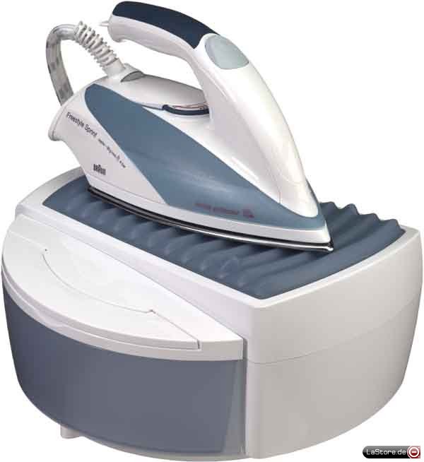 Braun FreeStyle Sprint SI9720. Bügelstation mit einer Leistung von 2400 W und einem Dampfdruck von 4 bar. Der Wassertank mit einem Volumen von 0,9 l kann ist abnehmbar. Zur weiteren Ausstattung gehören: Silikonplatte zum Bügeleisenabstellen, Wasser-Nachfüllanzeige, Anzeige für Dampfbereitschaft