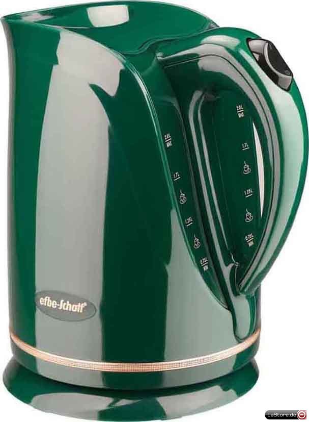 Ausführung: WasserkocherHeizschlange: verdecktFassungsvermögen: 1,7 lWerkstoff des Behälters: KunststoffLeistung: 2000 WWasserstandanzeige: außenFarbe: grün