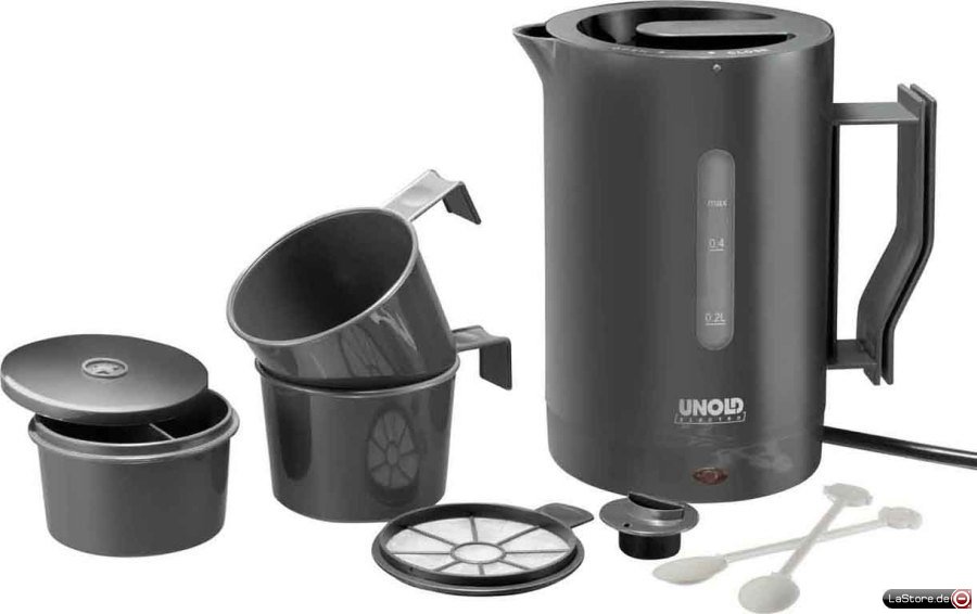 Ausführung: WasserkocherHeizschlange: verdecktFassungsvermögen: 0,5 lWerkstoff des Behälters: KunststoffLeistung: 1000 WWasserstandanzeige: außen