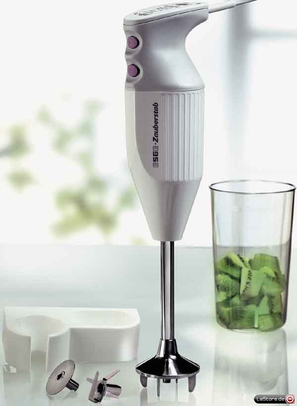 10.000/14.000 U/Min., Twinschalter, KB-Zeit 5 Min., mit Aufsteck-Zentrierung, Zubehör: Multifunktionsmesser, Schlagscheibe, Becher, Wandhalter, Rezeptanleitung