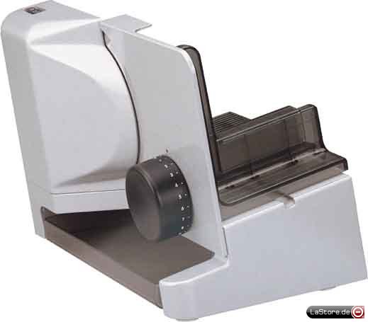 Gehäuse aus hochwertigem Kunststoff, Andruckplatte und Auflegetisch aus Metall, abnehmbarer Schiebeschlitten, Auffangschale, Moment- /Dauerschalter, kindersicher, Schrägstellung von Messer, Andruckplatte und Auflegetisch, Wellenschliffmesser mit 17 cm Ø