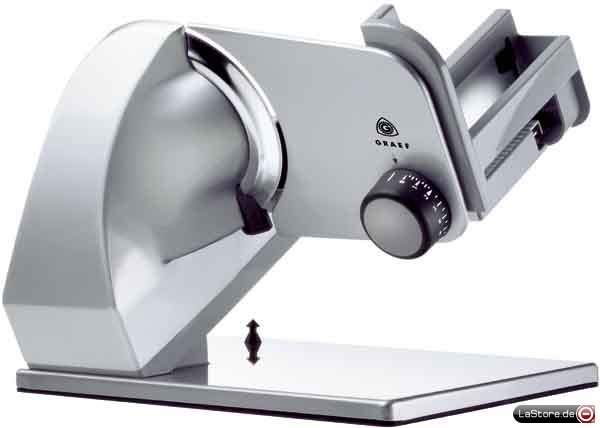 Schwenk-Schneider mit großer Aluminium-Bodenplatte. Messer aus Edelstahl 170 mm Ø, Kurzzeitbetrieb 9,5 Minuten, abnehmbare rostfreie Messerabdeckplatte, Diamat-Messerschärfer, großer Schlitten mit Edelstahlauflage, Kindersicherung durch Schalterverriegelung