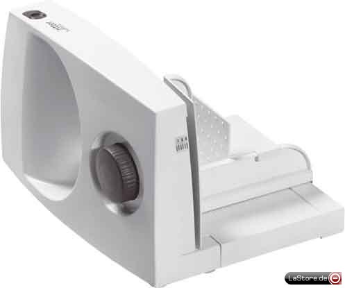 Gehäuse aus hochwertigem und pflegeleichtem Kunststoff, klappbarer Auflegetisch, Messer 17 cm Ø, Sicherheits- Moment- und Dauerschalter mit Einschaltsperre, abnehmbarer und teilbarer Schlitten zum Platzsparen