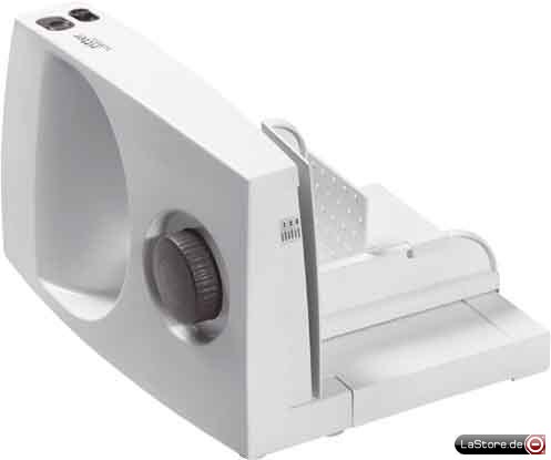 Gehäuse aus hochwertigem und pflegeleichtem Kunsttstoff, klappbarer Auflegetisch, Messer 17 cm Ø, Sicherheits- Moment- und Dauerschalter mit Einschaltsperre, stufenlose elektronische Regelung der Messerdrehzahl, abnehmbarer und teilbarer Schlitten zum platzsparen