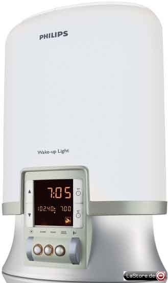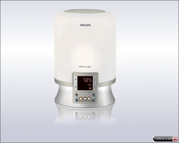 Lassen Sie sich ab jetzt nicht mehr aus dem Schlaf reissen: der Wecker simuliert mit einem langsam heller werdenden Licht einen Sonnenaufgang und sorgt zusammen mit drei natürlichen Wecktönen für nachweisliches Wohlbefinden beim Aufwachen. Die Glühlampe hat eine Intensität von 400 Lux und verfügt über ein natürliches Tageslicht-Spektrum. Das Wake-Up Light von Philips verfügt auch über ein Radio.