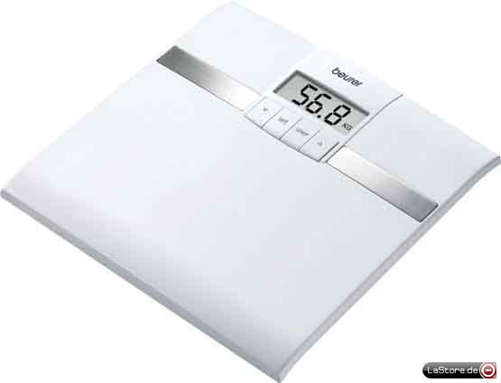 Werkstoff der Trittfläche Kunststoff, Anzeigeart digital, Messwertunterteilung 100 g, Farbe weiß, Max. Belastbarkeit 150 kg, Speicherfunktion, Körperfettanalyse, Stromversorgung Lithium-Batterie, Farbvariante weiß